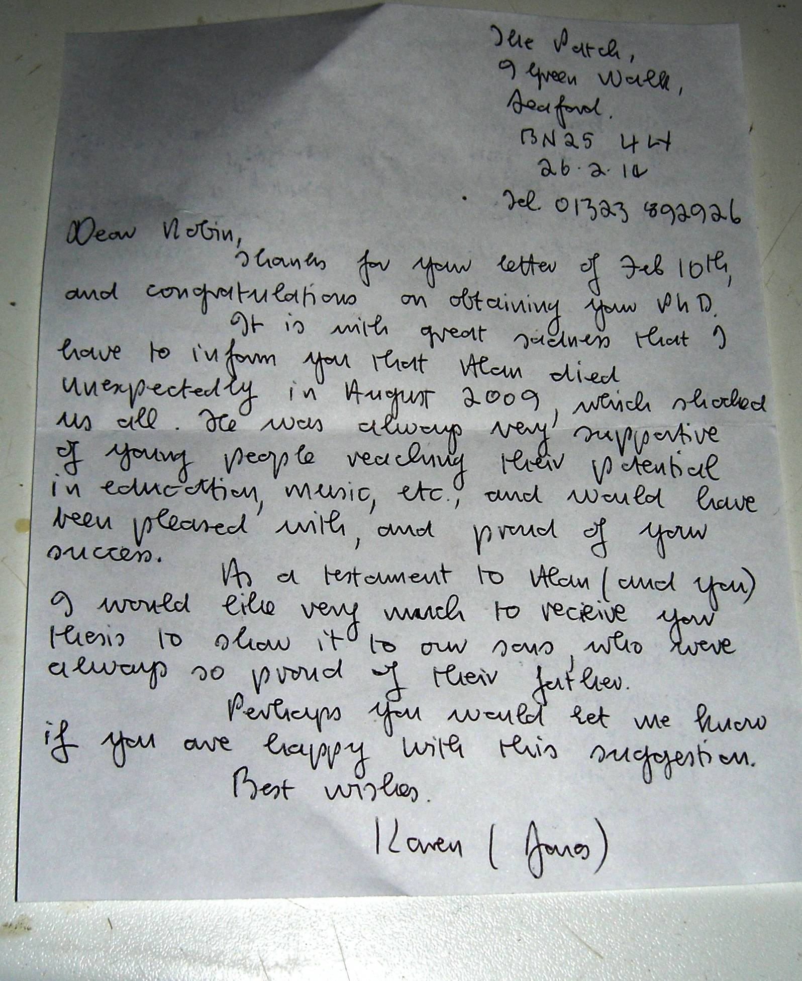 letter from Karen Jones
